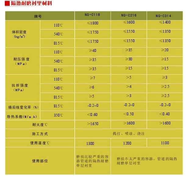 三、高耐磨襯里料各項技術參數及理化指標: