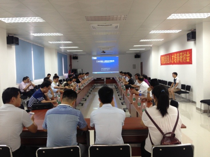 上午9時,與會代表一行參觀了佛山市智能裝備技術研究院,佛山華數機器人有限公司賀部長帶領大家參觀了機器人生產研發車間,介紹了華數機器人最新研發產品。然后,與會代表一起座談,針對如何校企合作,建設智能制造示范基地,培養時代需要的智能制造人才進行研討。