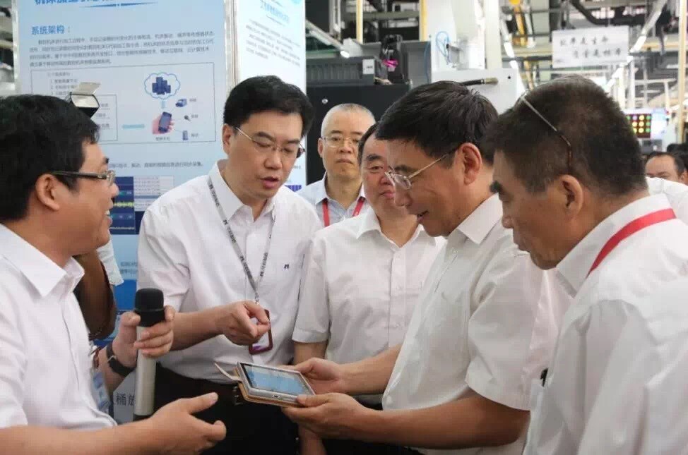 華中數(shù)控陳吉紅董事長向苗圩部長和周濟(jì)院長匯報車間大數(shù)據(jù)、機(jī)床健康保障、斷刀檢測、工藝參數(shù)優(yōu)化、二維碼故障診斷等智能功能