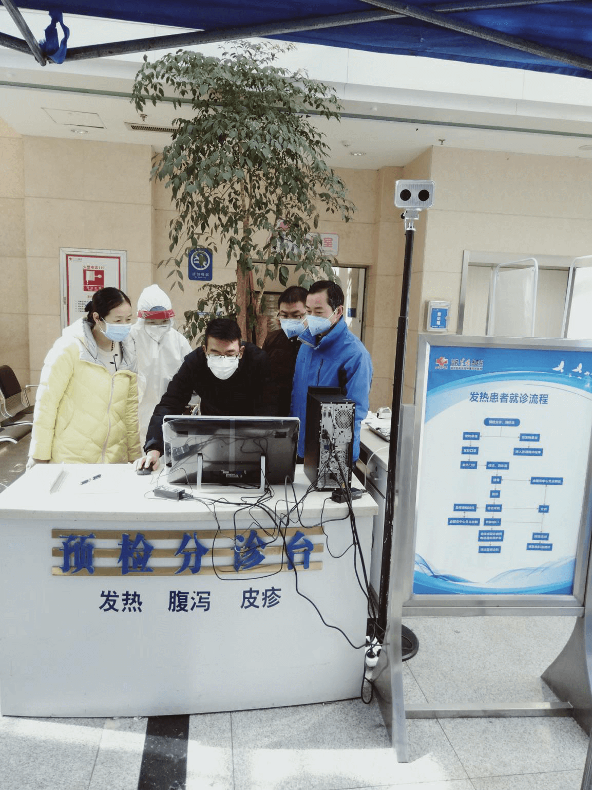 工程師在醫(yī)院現(xiàn)場(chǎng)安裝調(diào)試“紅外智能體溫檢測(cè)系統(tǒng)”