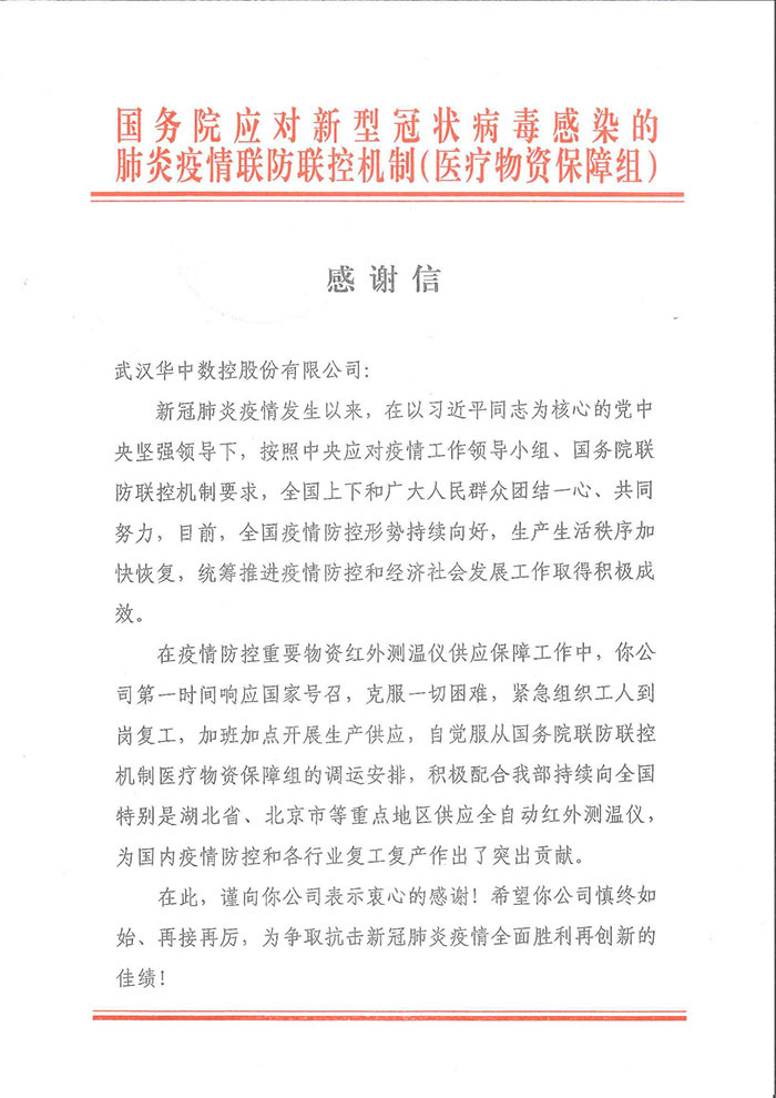 國務(wù)院聯(lián)防聯(lián)控機制醫(yī)療物資保障組由工信部主要負責同志任組長,主要負責醫(yī)用防護服、醫(yī)用護目鏡和眼罩、醫(yī)用口罩、消殺用品、負壓救護車、紅外體溫計等重點醫(yī)療物資的生產(chǎn)保障,統(tǒng)籌調(diào)度急需防疫物資。國務(wù)院感謝信中指出:華中數(shù)控公司“第一時間響應(yīng)國家號召,克服一切困難,緊急組織工人到崗復工,加班加點開展生產(chǎn)供應(yīng),自覺服從調(diào)運安排,……,為國內(nèi)疫情防控和各行業(yè)復工復產(chǎn)作出突出貢獻”。