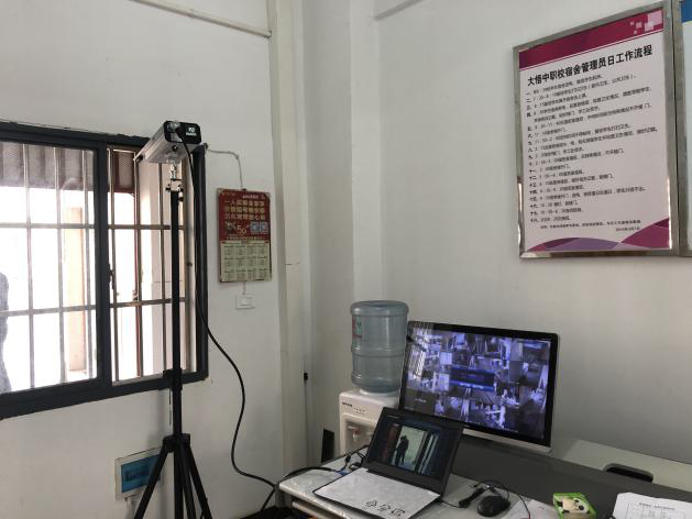 這幾天,大悟縣第一中學、大悟縣中等職業技術學院兩所學校都可以看到一個“黑科技”:一個紅外攝像頭,一臺筆記本。從攝像頭走過的人,都會被拍進筆記本顯示屏中,同時,人像的頭部會出現測量的體溫數據。?